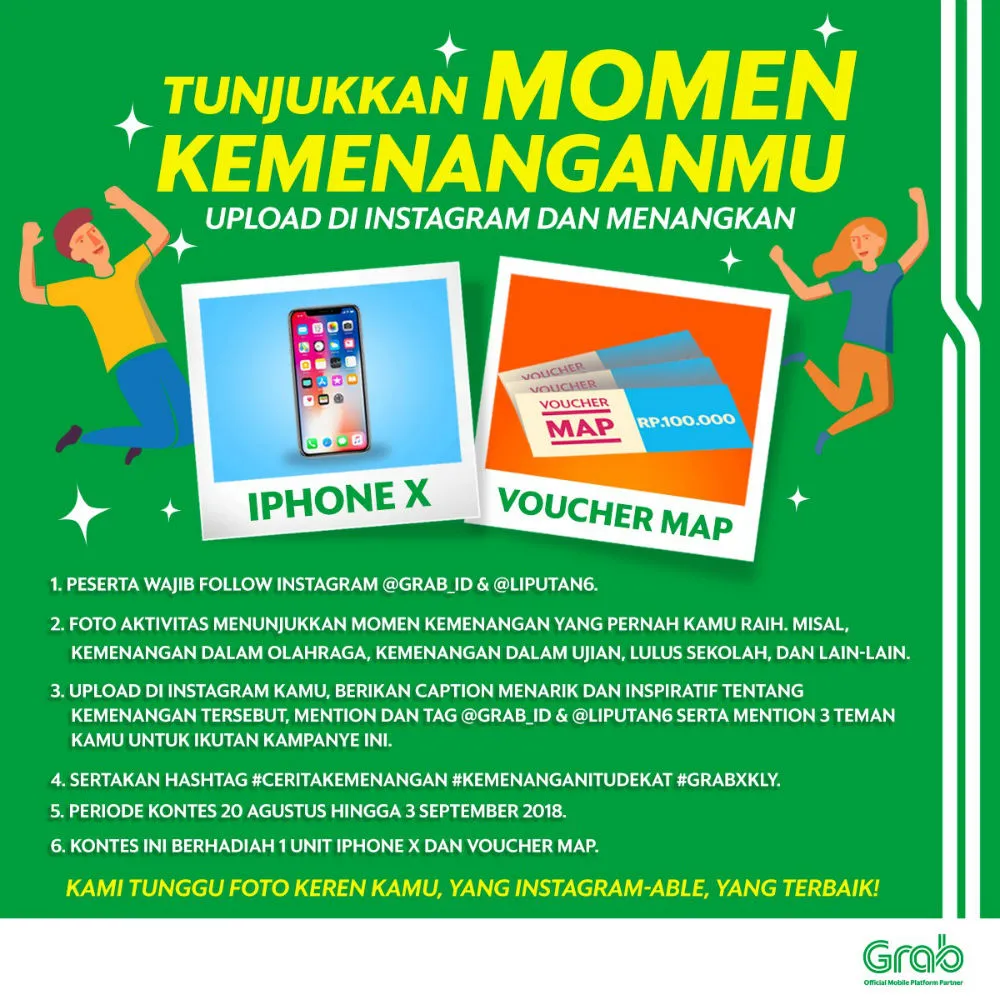 Grab sebagai official sponsor Asian Games 2018 sedang mengadakan kompetisi foto bertema Tunjukkan Momen Kemenanganmu. Untuk berpartisipasi dalam kompetisi ini, caranya follow Instagram @GRAB_ID dan @LIPUTAN6. Unggah berbagai macam momen kemenanganmu, misalnya kemenangan saat ikut kompetisi, kemenangan ketika berhasil lulus ujian hingga kemenangan telah mewujudkan apa yang kamu impikan.