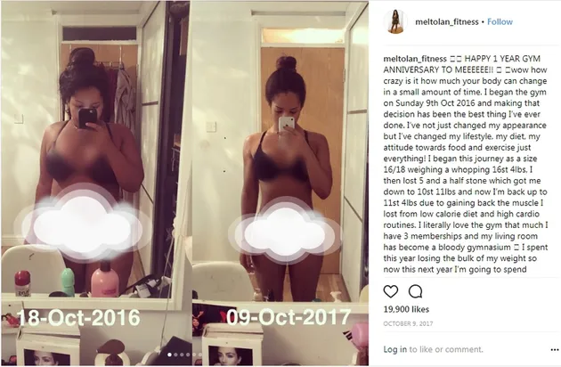 Ibu satu anak telah menurunkan 35,8 kg berat tubuhnya dalam satu tahun program dietnya. Kini berprofesi sebagai personal trainer. "Percaya pada prosesmu dan lakukan secara bertahap karena inilah cara yang masuk akal," Jelas Melissa saat followersnya menanyakan kunci dietnya.