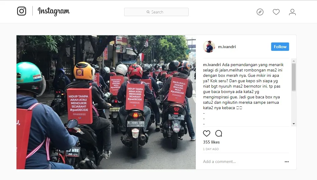 Gue DECIDE terbukti mampu menyajikan kegiatan promosi yang unik dan bikin orang lain jadi kepo. Rombongan motor dengan box merah saja sudah mencuri perhatian. Ditambah pesan yang tersaji lewat kata-kata pada box tersebut pastinya bikin para pengguna jalan dan netizen lebih mudah menangkap apa yang ingin mereka sampaikan.