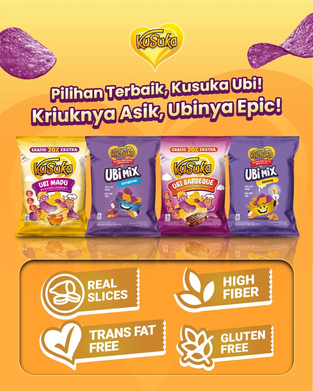 Kusuka Ubi punya kandungan tinggi serat, bebas lemak, dan gluten free. Nah, komposisi ini bikin momen ngemil tetap terasa lebih seru dan pastinya gulit-free. Pokoknya, Kusuka Ubi itu bukti nyata kalau ngemil bisa tetap fun dan mindful di saat yang sama.