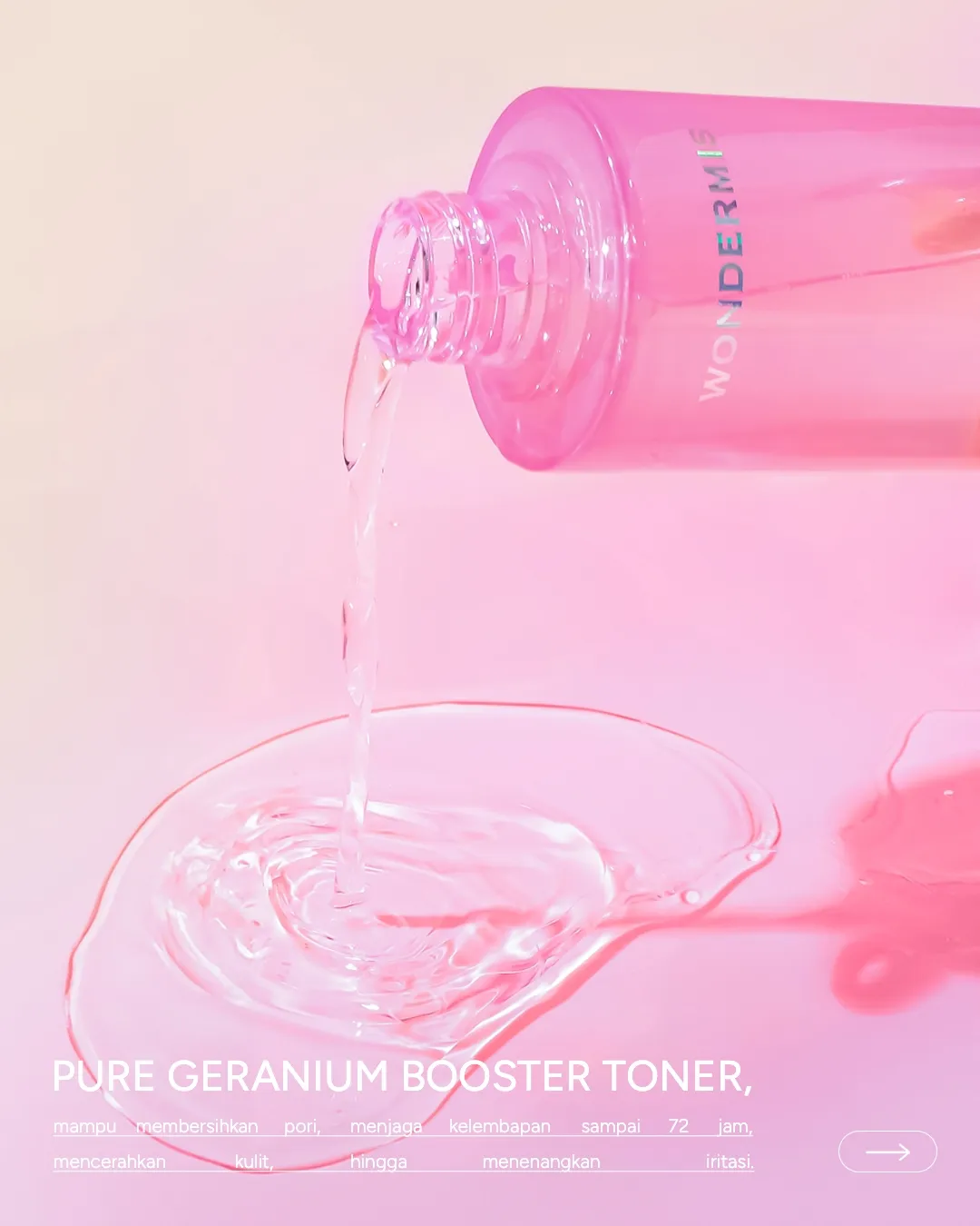 Kalau kamu mau cobain versi praktis dari skin flooding, Wondermis Pure Geranium Booster Toner adalah pilihan yang pas. Toner ini jadi hero product karena memadukan bahan-bahan clean dengan teknologi skincare Korea, dirancang khusus untuk kulit tropis yang gampang dehidrasi.