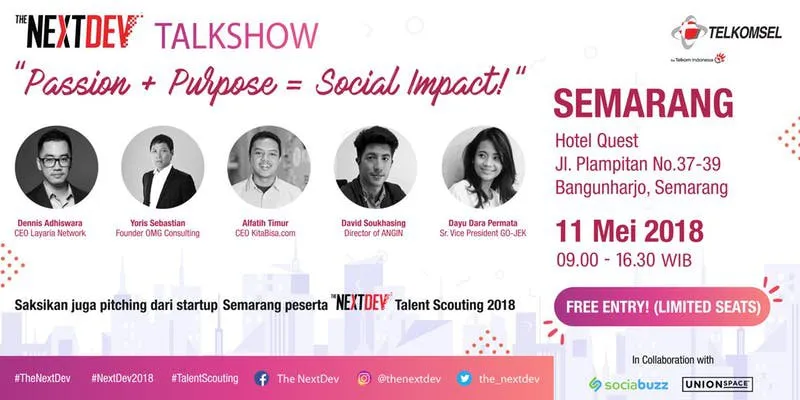 Sambil melihat apa saja ide startup terkini yang dilirik para juri, di akhir acara juga akan ada event talkshow seru. Acara ini gratis, buat supporter atau kamu yang ingin menonton presentasi para peserta. Talkshow yang berjudul PASSION + PURPOSE = SOCIAL IMPACT ini diadakan di Hotel Quest, Jalan Plampitan, Semarang.
